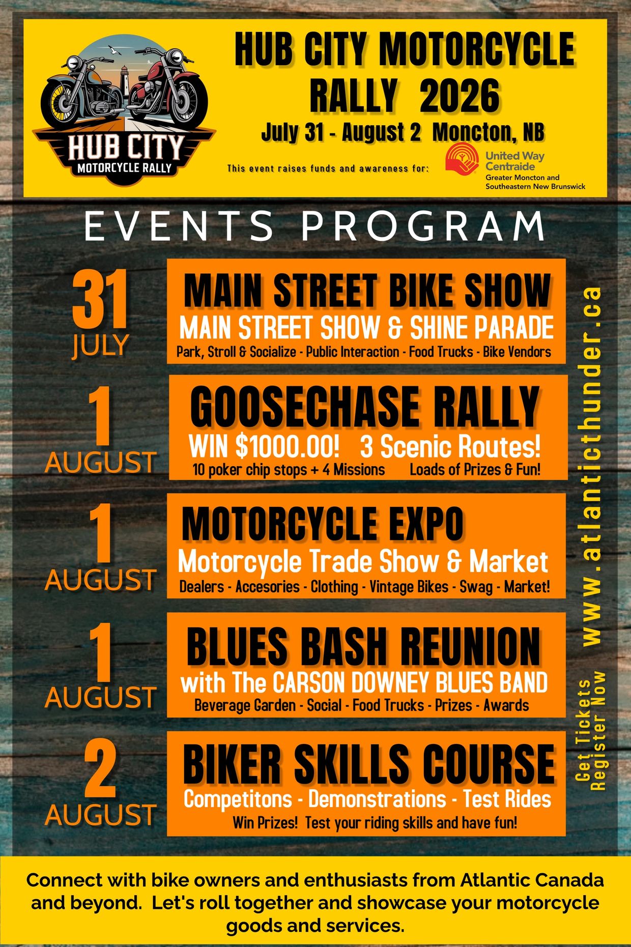 The Thunder rolls into Moncton from July 31 to August 2. Join us for a thrilling motorcycle festival and sign up to participate in the excitement,. It might get loud! Everyone is welcome.